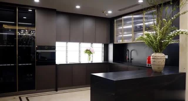 最后就是厨房的设计了~采用了开放式设计,整体的色调选择了沉稳大气的黑色和灰色,而且柜子的设计非常多,基本上将所有的物品都收纳得很好,这样的话,就减少了台面上的杂乱。